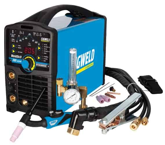 The CIGWELD WeldSkill 205 AC/DC comes as a complete kit with an 8m Remote Control TIG Torch, Argon Regulator/Flowmeter, 4m Electrode Holder and Work Clamp and a TIG Accessory Kit with tungstens, nozzles, collets etc. to get you up and welding in no time..