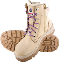 The Argyle Ladies is a 140mm derby style, lace-up ladies ankle boot with padded collar and tongue. A popular 100% comfortable choice for Mining, Construction and Road Workers with a TPU outsole heat resistant to 130 degrees and a 200 joule safety steel toecap. The Argyle Ladies has anti-static properties and premium water resistant leather available in black and wheat nubuck.